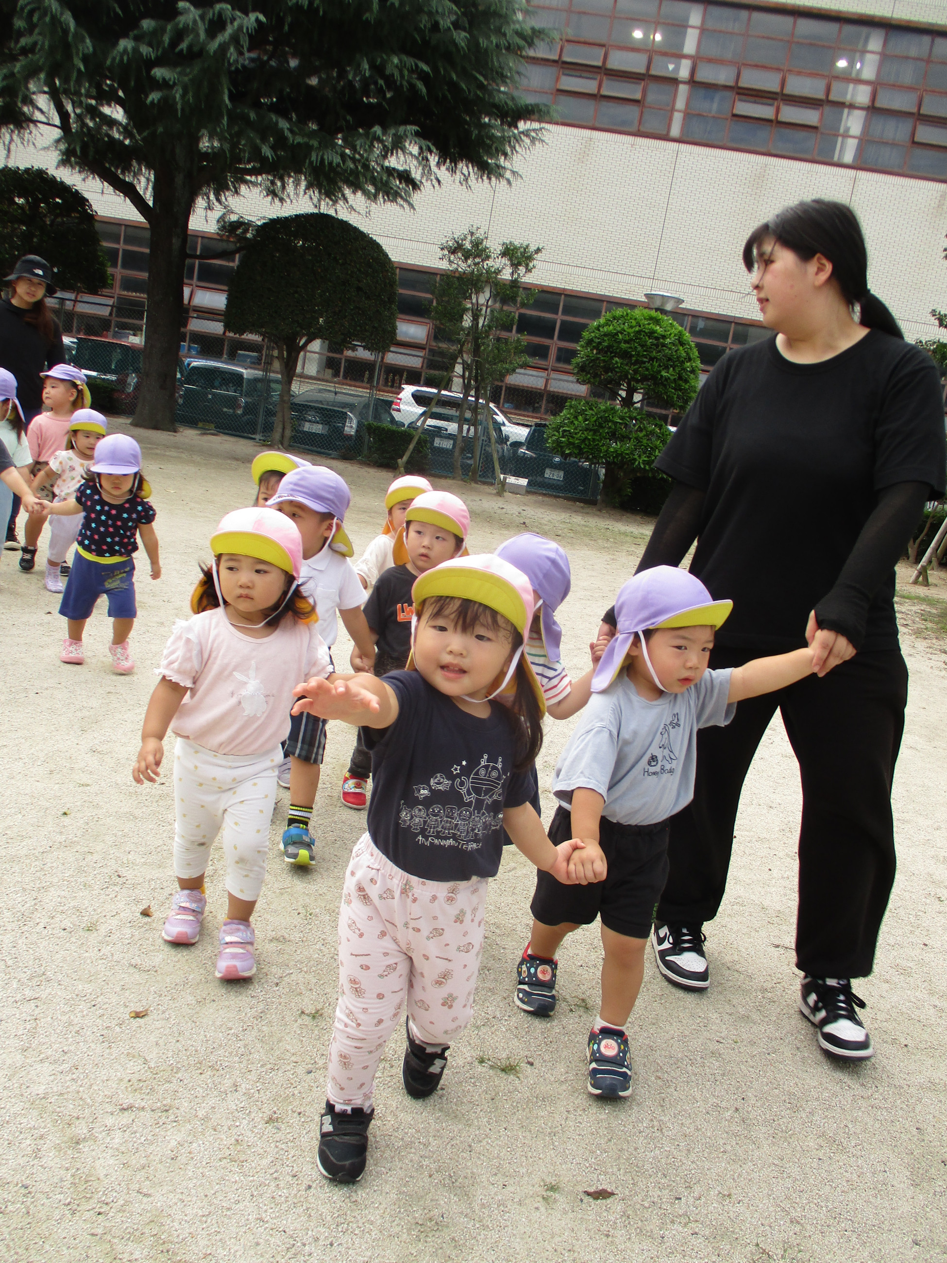 手を繋いでお散歩中!前のお友だちについて歩く練習中です(*^-^*)