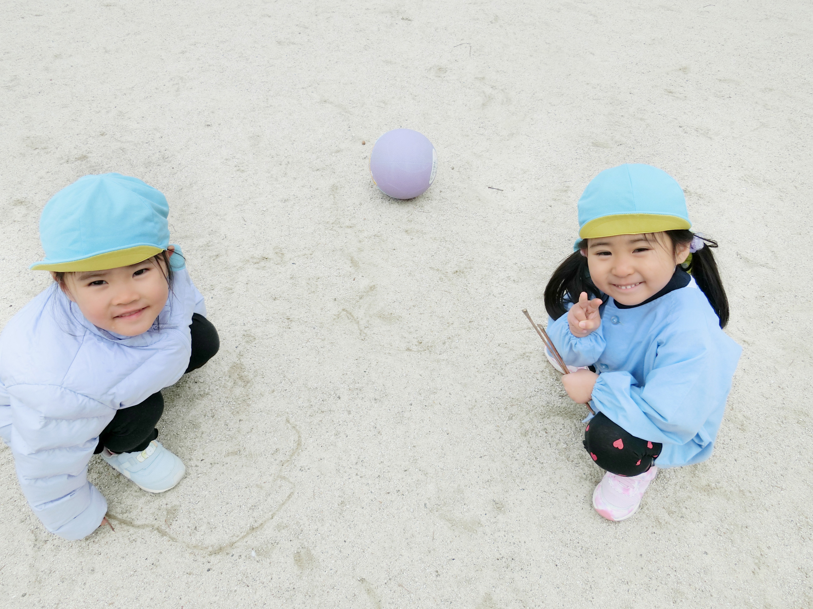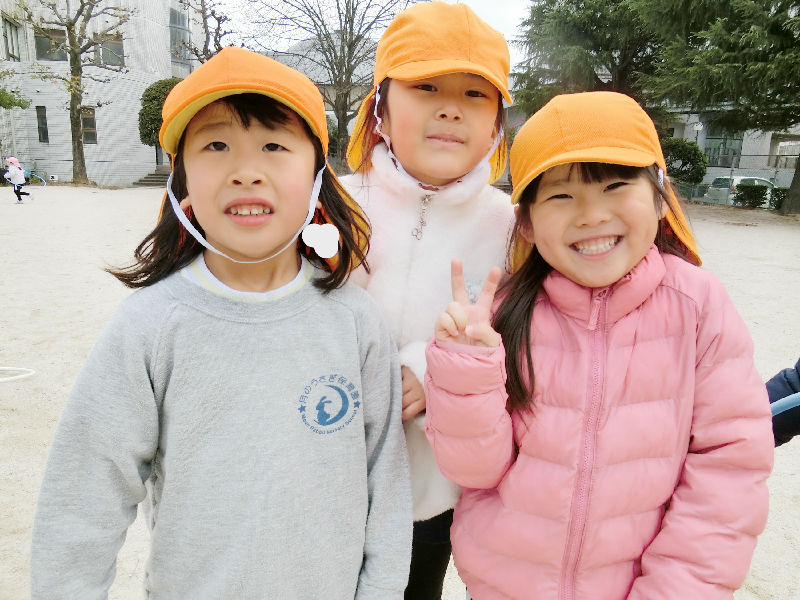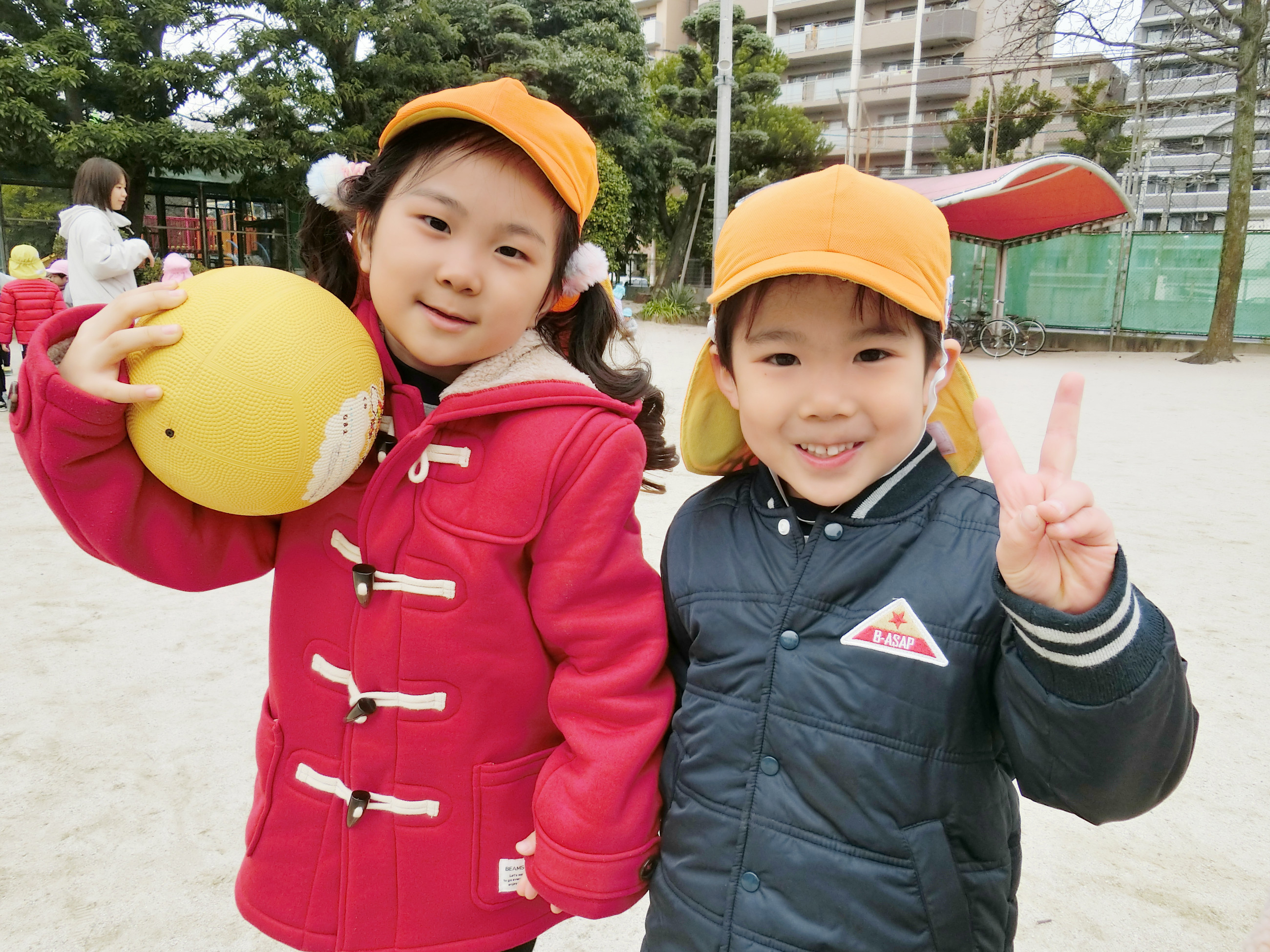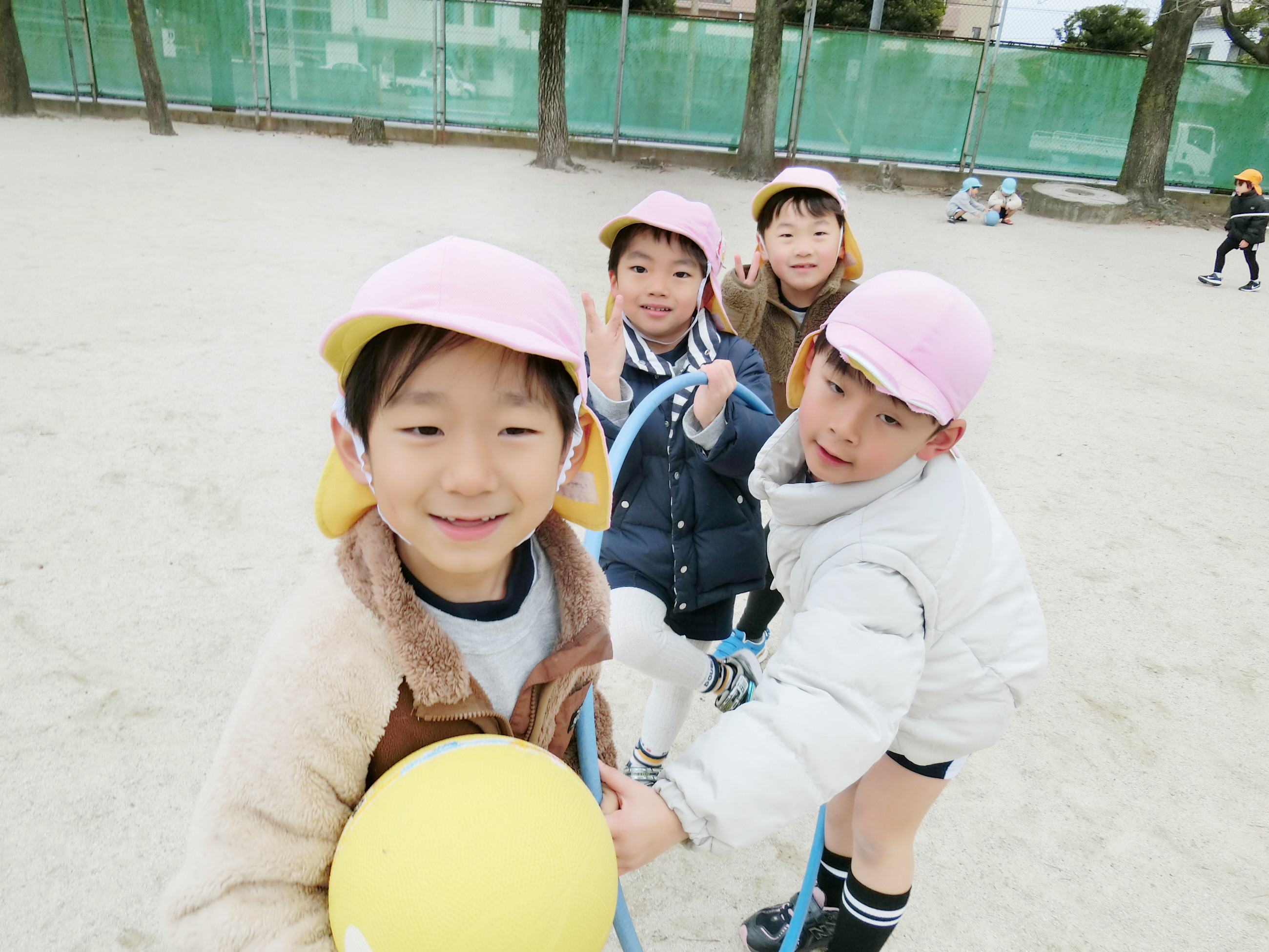 ですが、戸外遊びではニコニコ笑顔で走り回り体を温めたり!時には「暑い💦上着ぬごっと🎵」と暑がり半袖で遊ぶ子も(笑)。