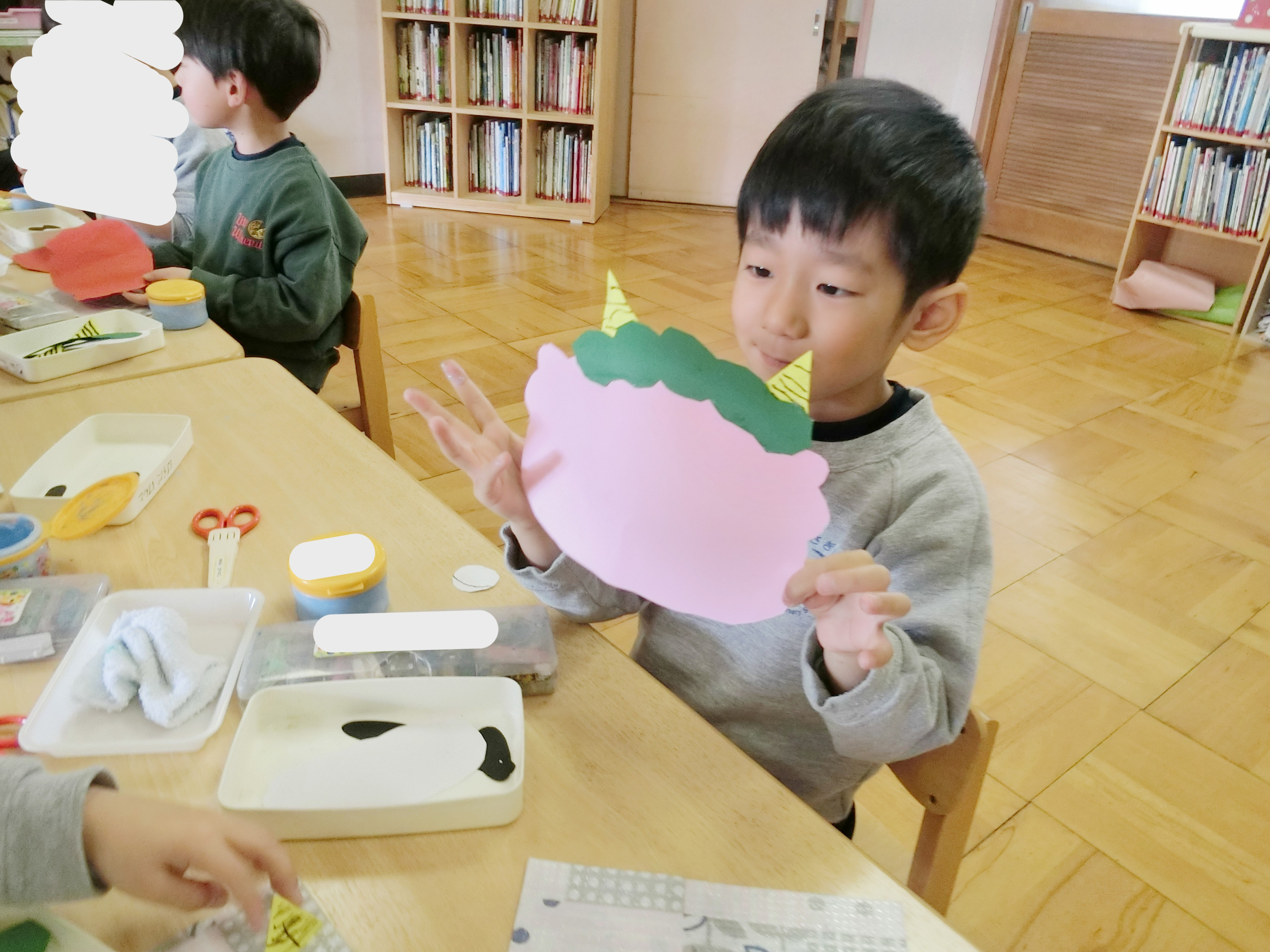 豆まき前に制作で、お面と豆箱を作りました👍❤️