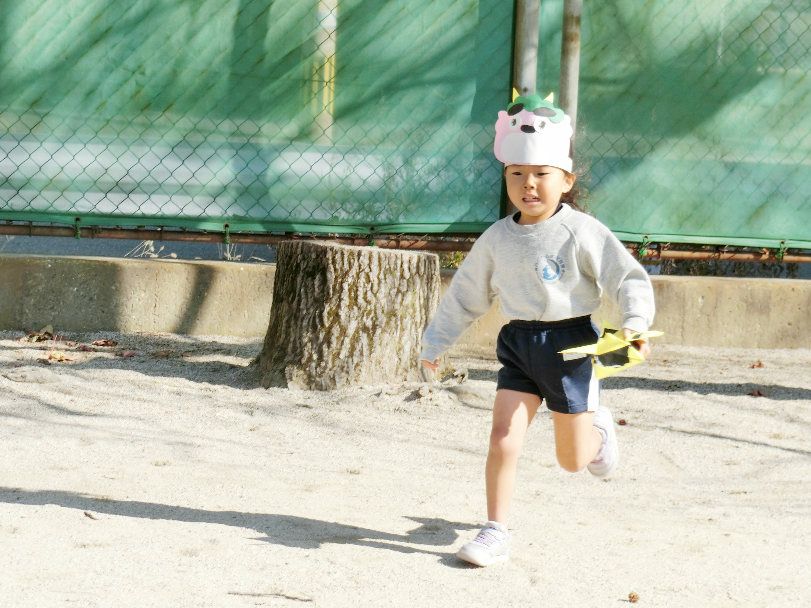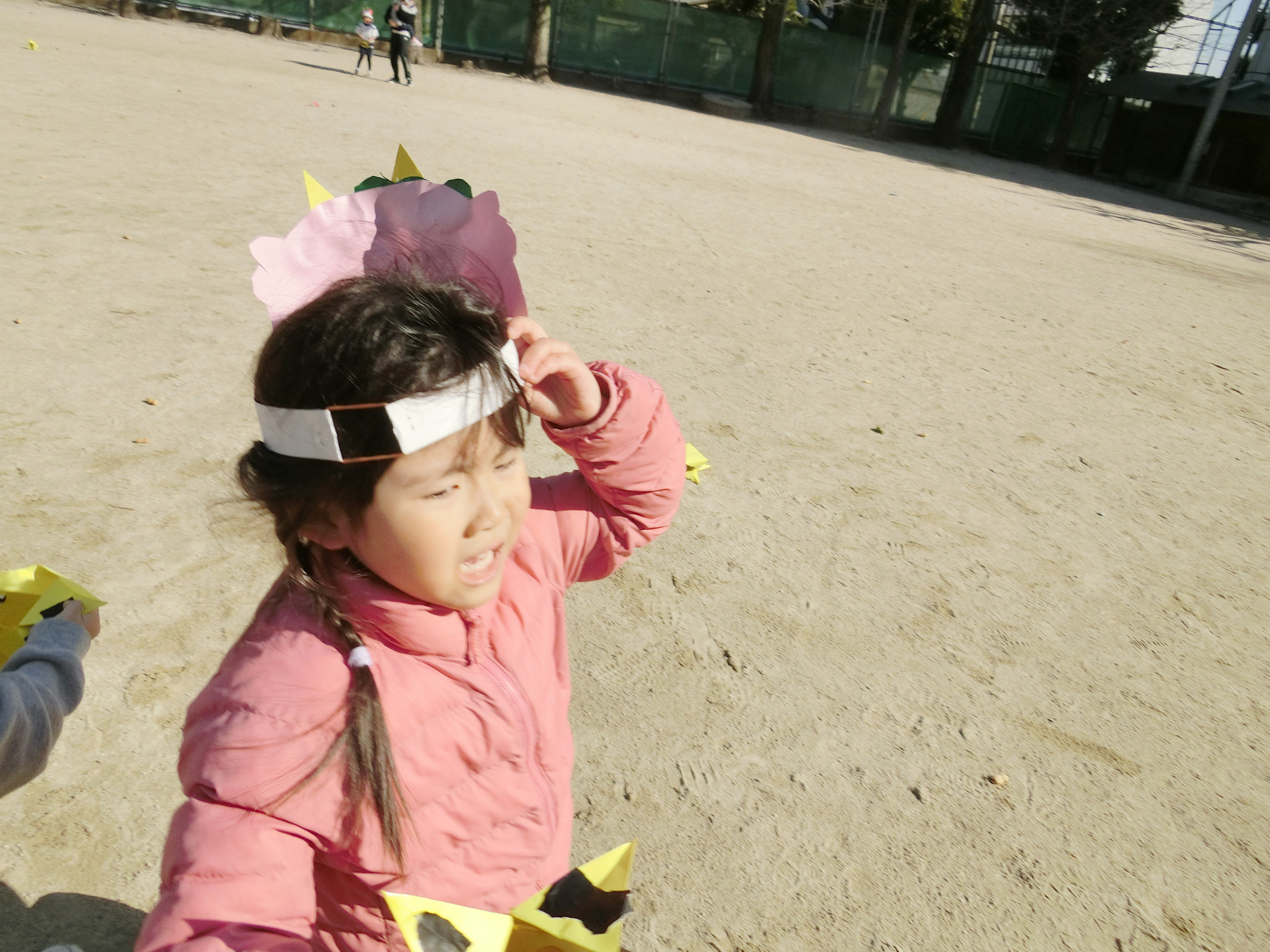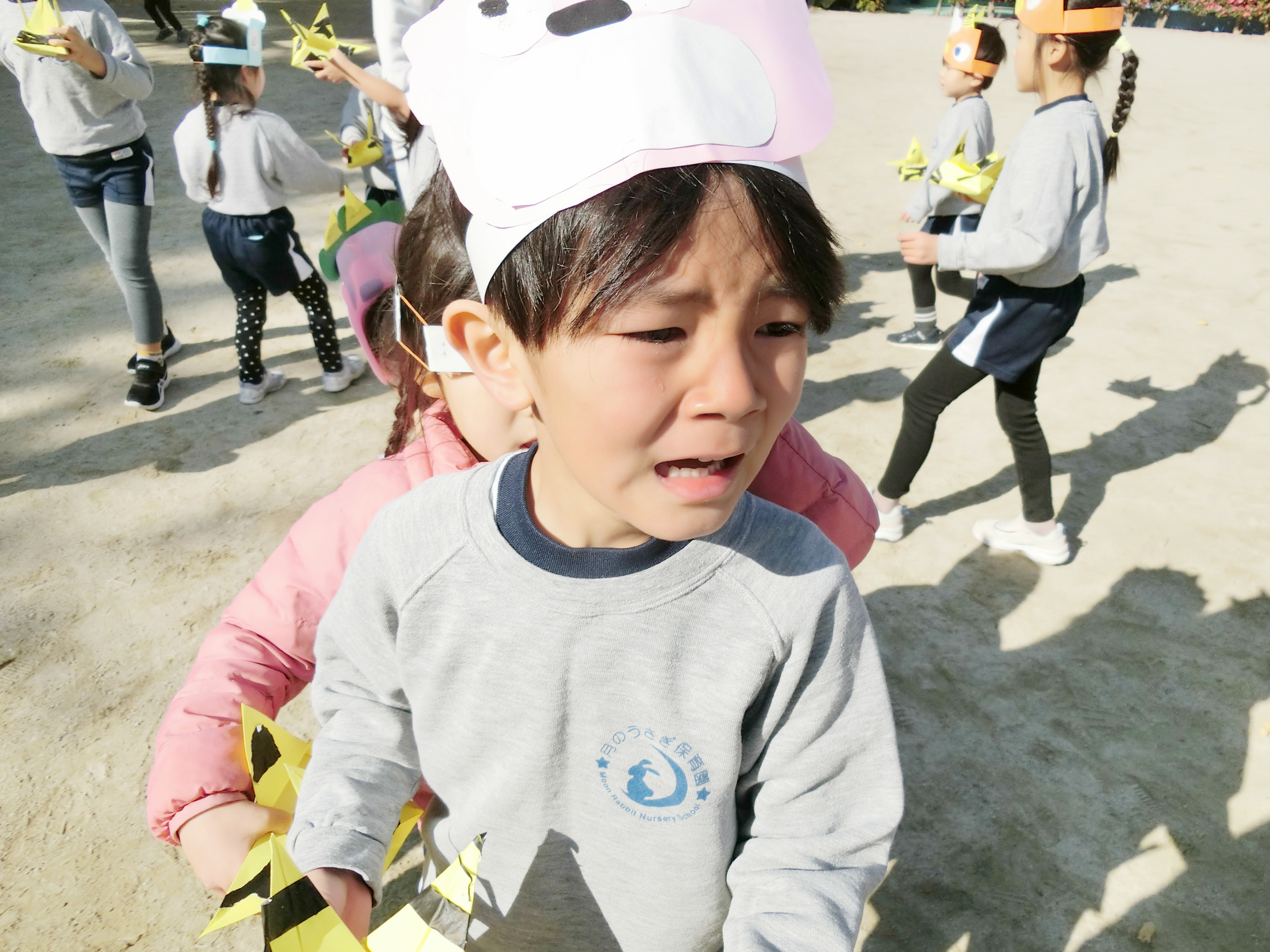 「みんな~豆まくよ~!」と言う保育者をおいて・・・逃げ回っています💦
